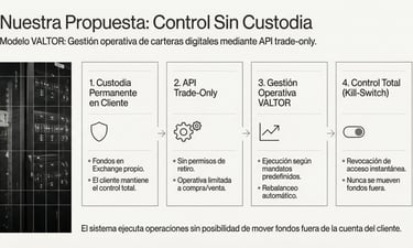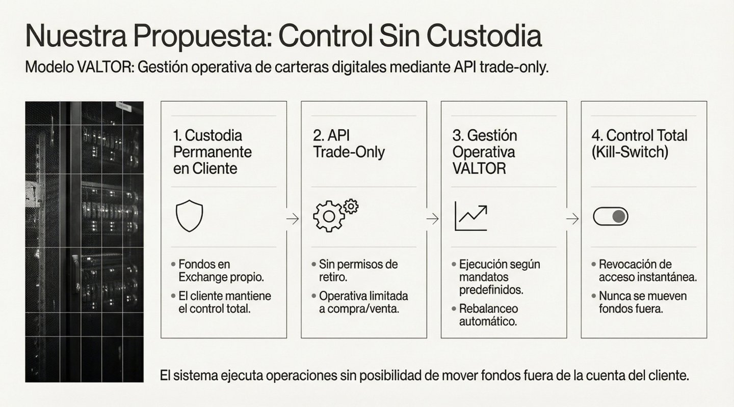 Aviso de Riesgo: Los criptoactivos son instrumentos altamente volátiles. La operativa en estos mercados conlleva un riesgo significativo de pérdida parcial o total del capital. El uso de apalancamiento y derivados en mandatos tácticos puede amplificar estas pérdidas. VALTOR Capital presta un servicio de gestión operativa y no garantiza rentabilidades pasadas ni futuras. Este sitio web no constituye asesoría financiera, legal o fiscal personalizada. El cliente reconoce que mantiene la custodia y responsabilidad final sobre su cuenta de exchange.